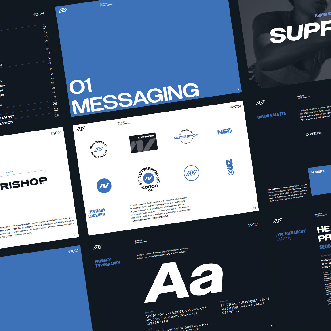 After 20 years of business, Nutrishop was looking for a rebrand to reflect their growth and their supportive approach to health and fitness. Much of the brand equity was maintained through the color palette while typography and primary marks were modernized. The logomark itself was designed to give a sense of movement and upward trajectory. With bright photography, often depicting group activity, the brand refresh tells customers that whoever they are and whatever their goals, Nutrishop is there to help.